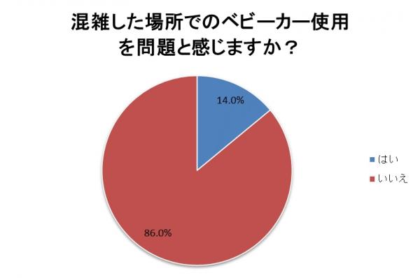 まず、パパママが混雑した場所でのベビーカー使用を問題と感じているか、について調査したところ、「はい」と答えた人が86%、「いいえ」と答えた人が14%と、問題と感じているパパママが圧倒的に多いことがわかりました。