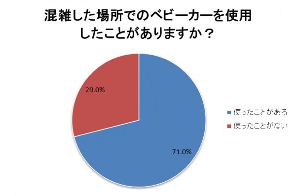 次に、混雑している場所でベビーカーを利用した経験があるか、について調査をしたところ、約7割が利用した経験があるとの回答がありました。周囲に配慮すべきであるとの意識は持ちつつも、混雑した場所でもベビーカーを使わざるをえなかったパパママが多いことがわかります。