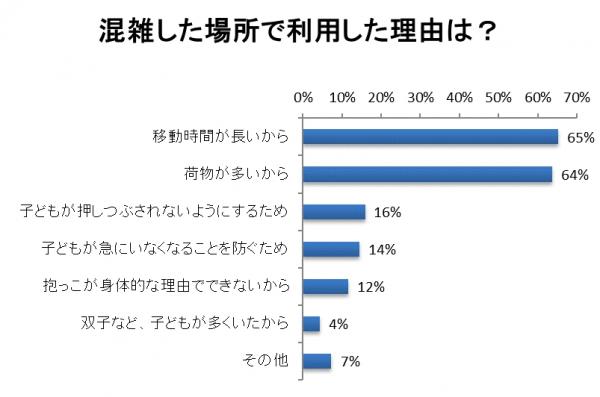 続いて、なぜ混雑した場所でベビーカーを利用したのか、その理由を聞いたところ、6~7割のパパママが、「移動時間が長いから」「荷物が多いから」と回答しました。