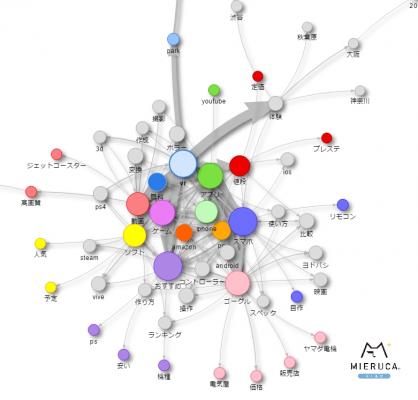 ミエルカの「サジェストキーワードネットワーク」機能を使って、「VR」を調べたユーザーの検索意図を可視化した例
