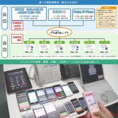 「ナイセンクラウド」は、例えば、海外や外出先でも場所関係なくどこでも03番号等の固定電話番号で発信・着信・内線ができる、ビジネスフォンやコードレス電話に代わる、クラウドPBXサービスです。
