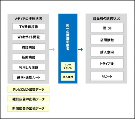 メディア別の広告効果を生活者の視点で評価することを目的に、同一の調査対象者に対して、メディアへの接触状況、商品・サービスの認知や購入意向などを調査したデータです。シングルソースデータは、個人が特定される情報ではありません。