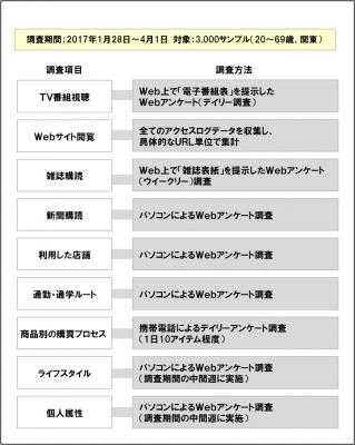 関東圏に居住する3,000サンプルの同一調査対象者(20~69歳の男女個人)から、2017年1月28日から同4月1日にわたって収集した、広告・宣伝メディアの接触状況と商品の購買行動に関するデータを、未加工のデータ(ローデータ)として提供します(データの特性と調査方法は、それぞれ図1、図2をご参照ください)。データ構成などの詳細は、専用サイトをご覧ください。
