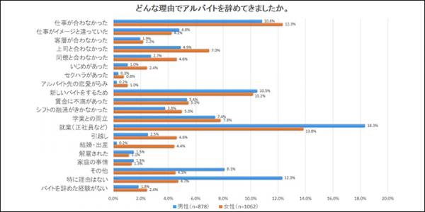 男女ともに「就業」「新しいバイトをする」というライフスタイルの変化を理由にバイトを辞めることが多いいっぽう、女性は男性よりも「上司と合わない」「同僚と合わない」「客層」「いじめ」など、アルバイト先の人間関係の軋轢で不満を持ちやすいようです。