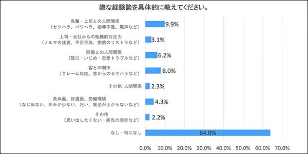 アルバイトで嫌な経験があると答えた人(有効回答数/男性 408人 女性 508人)に対して「嫌な経験談を具体的に教えてください」とフリーアンサーで募ったところ、最も多く寄せられたのは「先輩・上司との人間関係」(9.9%)に関する回答。しかしそのいっぽうで、「なし・特になし」と答えた人が6割以上になりました。
