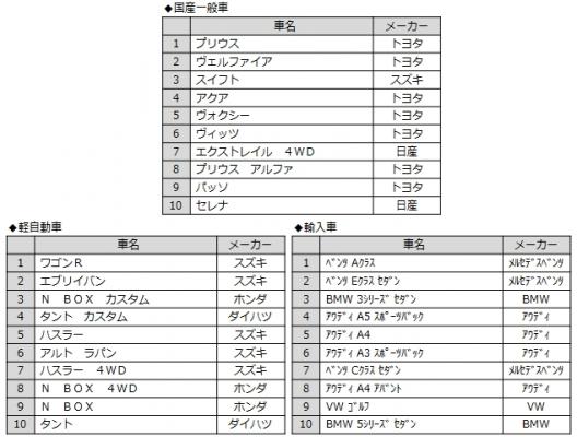 当ランキングは、全国約7,500店の中古車販売店が販売プロセスの一環であるTVオートオークションを利用し、ご成約頂いた車両について、国産一般車・軽自動車・輸入車に分けて集計したものです。