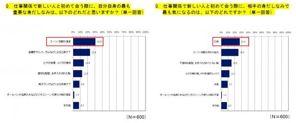 目覚めの口臭予防ラボの調査によると、仕事関係で新しい人と会う際、自分の身だしなみは「スーツ・洋服の汚れ」に気を付けますが相手の身だしなみでは「口臭」が最も気になるという結果が出ています。