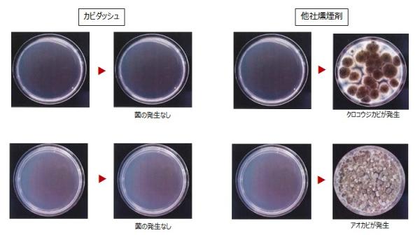 生活環境下に多く浮遊する真菌2属(クロコウジカビ・アオカビ)にて落下テストを実施。本品の優位性が確認されました。(寒天培地に、本品、他社燻煙剤をそれぞれ噴霧。10日間放置後、さらに25の状況下で5日間培養)