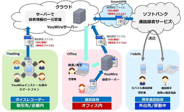 【YouWire(ユーワイアー)】とは、Officeオフィス固定電話の通話録音、Mobile 携帯電話の通話録音、Meeting会議(対面)の音声録音(ボイスレコーダー) の3つの音声を一元管理できる録音システムです。オフィスでの顧客との電話取引内容の確認に、外出先での携帯電話での通話の確認に、会議を録音した議事録の作成サポートに、と様々なシーンで利用ができます。