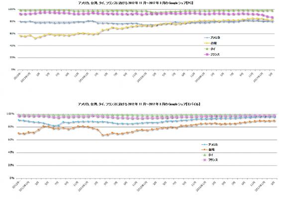 ■2017年4月 各国・地域におけるPCとモバイルの主要検索エンジンシェア