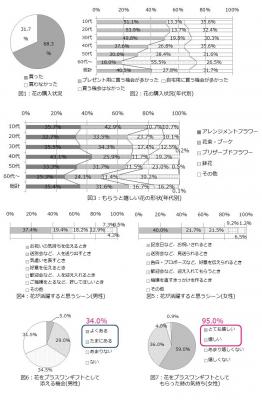 まず、過去1年における花の購入率は全体で68.3%となった。[図1] 年代が上がるにつれプレゼント用購入は減少傾向にあり、自宅用購入は増加傾向にあることが分かる。[図2]