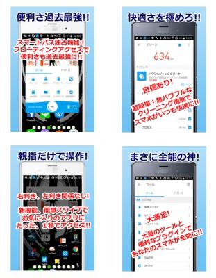 アプリクリーナー、バックアップと復元、ホーム画面ショートカット、端末のリアルタイム状況表示、システム情報、ワンクリックでの実行アプリ整理、キャッシュメモリーの消去、使用履歴の整理、通話履歴・SMSメッセージ削除など
