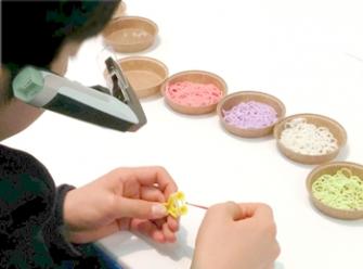 ウェアラブルデバイス(Telepathy Walker)で 作り方を見ながら手芸を行うアプリを体験いただけます。ウェアラブルデバイス上に作り方の動画と音声が流れますので、それを見ながら同じように製作を進めるだけで簡単な指輪やブレスレットが作れます。