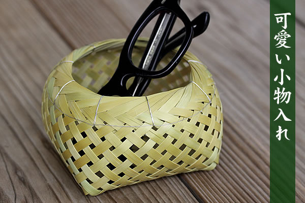 柔らかくしなやかな蓬莱竹の性質を活かしてつくられた蓬莱竹ミニ磯籠。時間の経過と共に堅く締まった感じになっていき、落ち着いた色合いに変わっていくのも魅力のひとつです。デスクの上に竹製の収納雑貨を置いて、忙しい中にもちょっとした癒しをご提供。アイデア次第で色々な物を入れて楽しんでもらえたらと考えています。