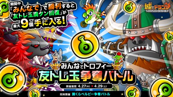 4月27日(木)より、みんなでトロフィーバトルに勝利すると、友トレ玉満タン回復が1個もらえる