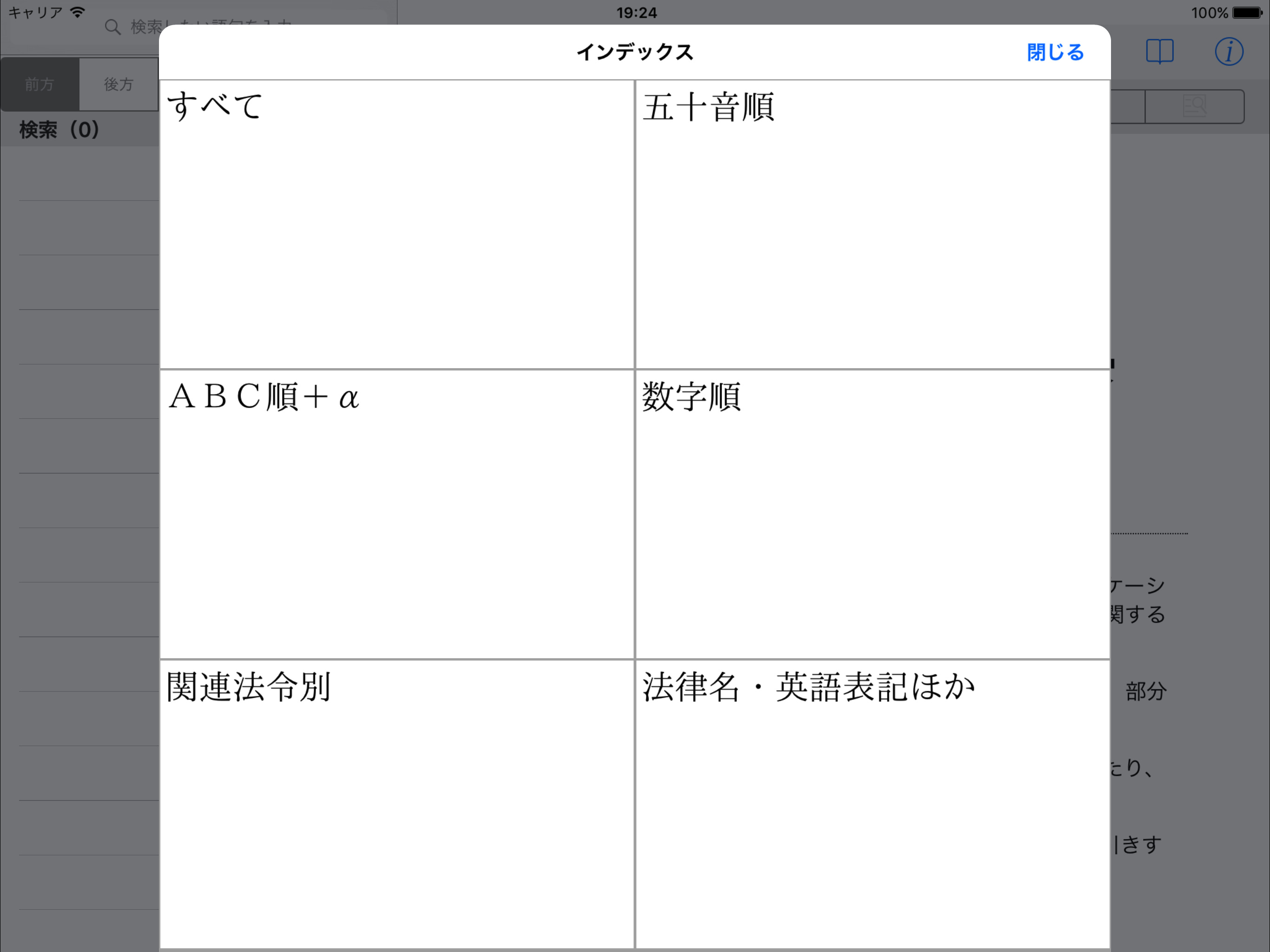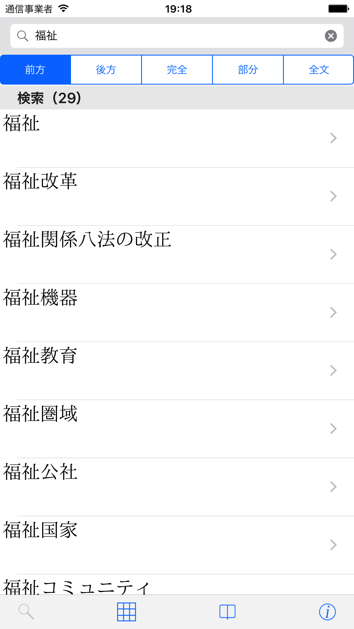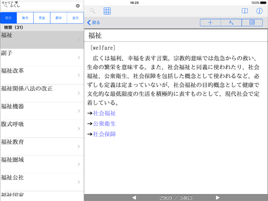 ●豊富な検索オプションを用意(前方一致 / 後方一致 / 完全一致 / 部分検索 / 全文検索)。それぞれの検索方法で、文字を入力すると候補見出し語が表示されるインクリメンタルサーチに対応。(部分 / 全文検索を除く)用語をうろ覚えでも検索が容易です。