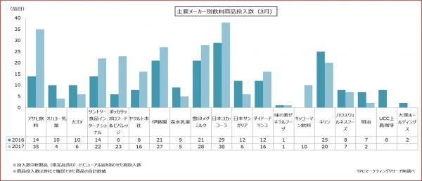 ■弊社が継続して調査している飲料新製品の発売状況を見ると、2017年3月では主要メーカー21社のうち17社が商品を投入(弊社で確認できたもの)。これらの商品投入数の合計は266品目となり、前年同時期と比べて49品目多くなっている。メーカー別では、日本コカ・コーラ(38品目)とアサヒ飲料(35品目)が30品目以上の商品を投入。同じく、雪印メグミルク(28品目)、伊藤園(27品目)、ポッカサッポロフード&ビバレッジ(23品目)、サントリー食品インターナショナル(22品目)、キリン(20品目)が20品目以上の商品投入数となっている。