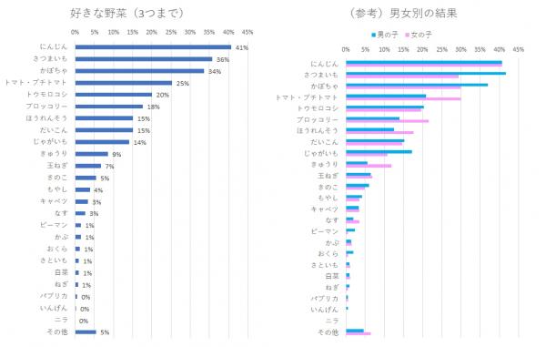 男の子はさつまいも・かぼちゃ・じゃがいもを好み、女の子はトマト・ブロッコリー・ほうれんそうを好むという差異が出ました。