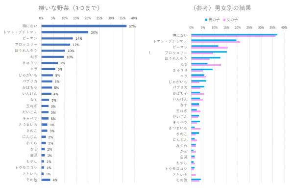 特に好き嫌いがないという層が約4割。男の子はブロッコリー・ほうれんそう・きゅうりを嫌い、女の子はピーマン・ねぎを嫌うという差異が出ました。