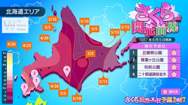 この先、北海道では5月6日頃に暑さがいったん落ち着きますが、そのあと9日から再び気温が平年より高い状態に戻りそうです。道北・道東のさくらのつぼみも、生長が進むでしょう。開花日は、稚内で5月10日、釧路は5月15日の予想で、5月中旬に見頃を迎えるでしょう。5月末には、さくらの季節もいよいよ終了となりそうです。