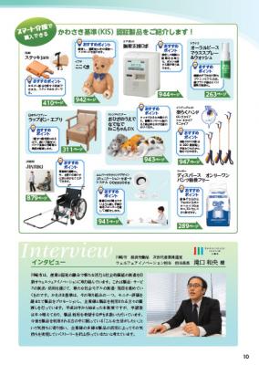 「スマート介護」カタログでは、「かわさき基準」特集ページでその理念・概要を川崎市担当者のインタビューを交えて掲載し、安全で負担が少ない口腔ケア「オーラルピース」、ステッキホルダー「ステッキjam」、メッセージが送れるぬいぐるみ「ここくま」など、代表的な製品をご紹介しています。