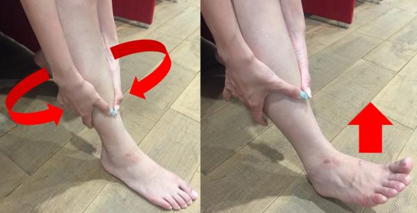 両手で輪を作るようにふくらはぎを包み込み、5本の指で絞るようにふくらはぎに溜まった血液やリンパを押し流していきます。この時、「締める」「緩める」「移動」という動きを繰り返す(足首から膝方向にかけて行う)ことで、体液が流れやすくなります。ただ押したりもんだりするのではなく、この3動作を行ってください。また、可能であれば「締める」動作の時に足首を上下に5回くらい動かしていただくと、より深部の筋肉に刺激が加わり効果的です。