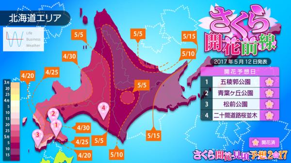 官署の最終地点となる釧路では5月15日に開花するでしょう。稚内など道北のさくらは来週半ばにかけて見頃となりますが、今週末は冷たい雨の降る寒さになるため、さくらを見に行く場合は雨具と防寒具が必要です。釧路でも19日頃に満開の発表がありそうで、道東は5月下旬にかけて見頃となるでしょう。