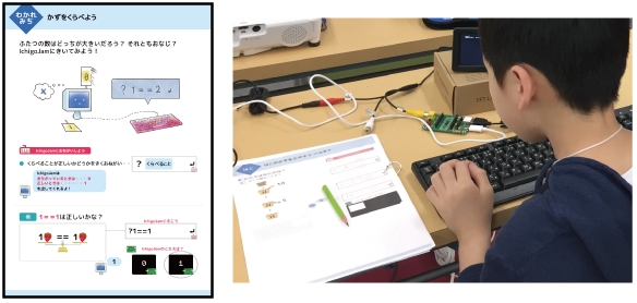 ジュニアコースでは、プログラミングの基礎概念と算数の基礎を織り交ぜた学習用ドリル「プログラミングさんすう」を用い、アクティビティやゲームで遊びながら、プログラミングの基礎概念を学ぶことができます。