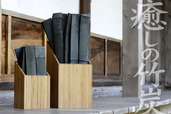 癒しの竹炭セットが竹集成材の箱入りになって登場。従来は孟宗竹(もうそうだけ)の竹材そのままを使った入れ物でしたが、竹集成材に変更することで洗練されたシャープな印象になりました。サイズは大と小の2種類をご用意、大は約1.3kg、小は約300~400gの平竹炭入りです。