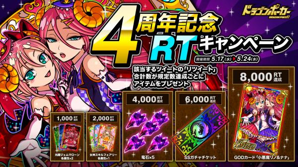 『ドラゴンポーカー』4周年を記念して、「4周年記念RTキャンペーン」を開催いたします。