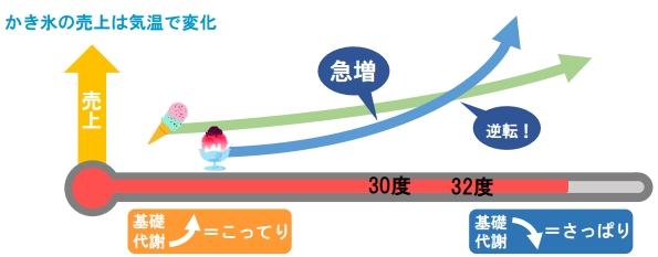 なお、約32度でかき氷とアイスクリームの売上が逆転することもわかっています。