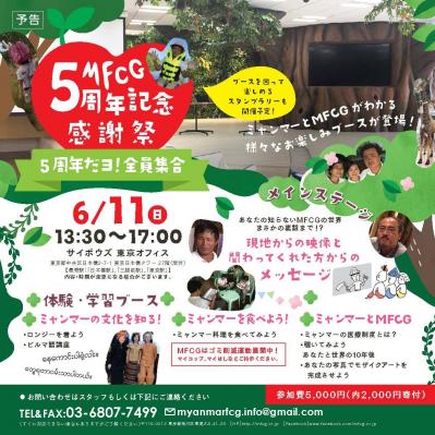 そこでMFCGは、創立5周年にあたり、その経験と人脈で培ったミャンマーの生きた情報を多くの人に提供することといたしました。イベントでは、写真などを活用しながらミャンマーの医療制度や保健衛生の実態などを説明するほか、ミャンマー料理や民族衣装を体験したりビルマ語に触れたりする場を設けます。