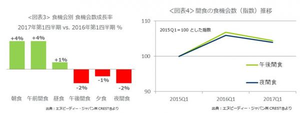 食機会別の成長率(図表3)をみると、朝食と午前間食が大きく成長しているのが分かります。2016年に4期連続でプラス成長だった午後の間食と夜の間食は、今期はマイナス成長となりました。間食の伸びをけん引していたCVSとスーパーの成長鈍化が一因ですが、食機会数の推移をみてみると(図表4)、依然2015年の水準より高い値であることが分かります。