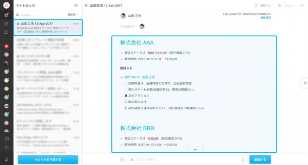 営業日報に重要な情報を集約し、社内コミュニケーションツールにて誰とでも
