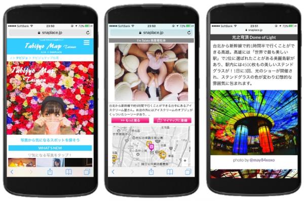 SNAPLACE(http://snaplace.jp/)とは、あらゆるSNS投稿を分析し、SNS映えするスポットだけを地図上に表示するサービス。サービス開始から初月40万PV超の人気サイト。観光ガイドでは紹介されない、知る人ぞ知るニッチなスポットもカンタンに探せる。また、スポット毎に、InstagramやTwitter等の投稿を一覧し、口コミを確認できる。各スポットは、おしゃれ(Cool!)、ネタ(Haha!)、定番(Basic)の3種類に色分けされ、地図上に表示されている。また、観光スポットとレストラン・カフェも簡単に見分けられ、各スポットの特徴が3秒で分かる。台湾のSNS映えスポット一覧(https://snaplace.jp/maps/?id=112 )や2016年のSNS映えランキング( https://snaplace.jp/2016snsbaeranking/ )も紹介