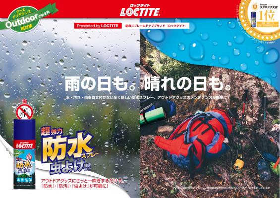 ドイツの化学・消費財メーカー ヘンケルの日本法人ヘンケルジャパン株式会社(本社:東京都品川区 社長:金井 博之)の一般用接着剤事業本部は、アウトドア愛好者をターゲットとした新しいコンセプトの防水スプレー『ロックタイト 超強力防水スプレー 虫よけ機能つき』を6月15日に発売します。テントやチェア、レイングッズ、小物やブーツなどにさっとひと吹きするだけで、「防水」+「防汚」+「虫よけ」を1本で実現するアイテムです。