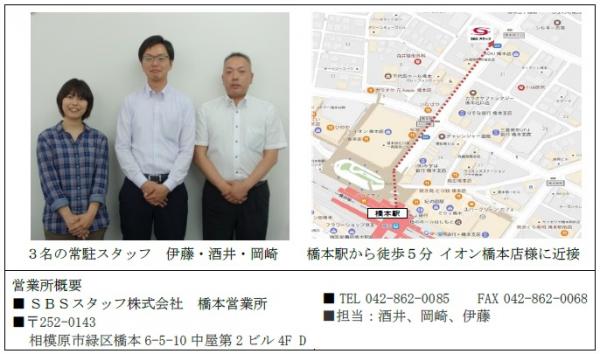 SBSグループで人材サービスを行うSBSスタッフ株式会社(社長:山口英一、本社:東京都墨田区)は、5月1日、相模原市緑区橋本に営業所をオープンいたしましたのでお知らせします。