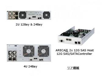 S212-12SS2Rシリーズ、S224-12SS2Rシリーズ および S424-12SS2R シリーズは、ARECA社のハードウェアRAIDコントローラを使用した、2ポートの 12G SAS (SFF-8644) ホスト接続が可能なストレージシステムです。