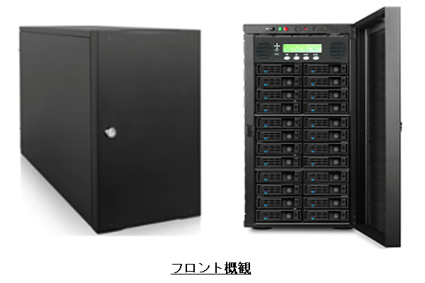 24台の2.5インチ・ドライブは、システム内部の温度に応じて回転数が変化する、2台のDELTA社製の長寿命ボールベアリングPWM(Power Width Modulation)方式ファンで冷却されます。ファン障害、システム内部温度上昇、ディスク障害が発生した場合はリセット機能を備えたアラーム音及びLEDで通知され、SMTPによるE-mail、SNMTよるリモート・マネージャーへの連絡も可能です。さらに、独自の監視ユーティリティーを開発する為のAPIライブラリーが用意されています。