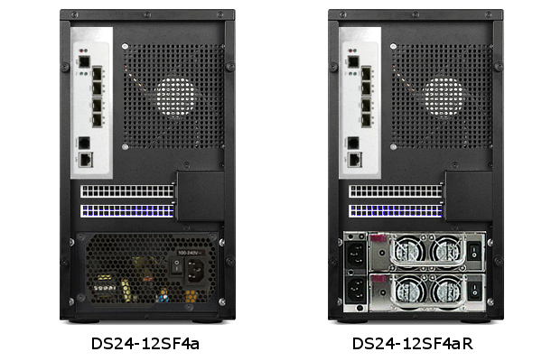 シングル電源モデルのDS24-12SF4aでは、ピーク電力を抑制して消費電力を低減するPFC回路を搭載した、500W 80Plusブロンズ規格電源を搭載しています。電源冷却用の12cmファンには、可変速のダブル・ボールベアリング・ファンを使用しています。