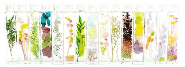 「フラワーアクアリウム」は、オイルの光学特性によって、花材がガラスに閉じ込められたかのようにひときわ明るく美しく見える新感覚のハーバリウムアイテムです。