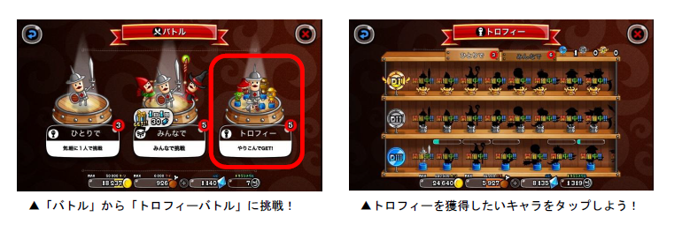 「トロフィーバトル」は、各キャラのトロフィー獲得を目指して、全国のプレイヤーとバトルを行ないます。