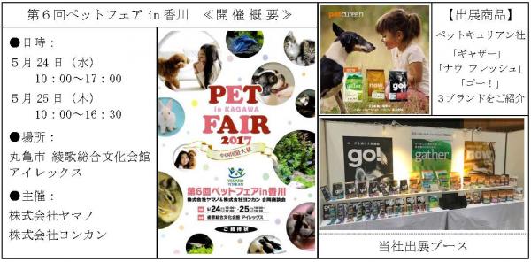 同社は5月24日から2日間にわたり開催された、ペット専門店を対象とした展示会「第6回ペットフェアin香川」に出展。同社が日本輸入総販売元となるペットキュリアン社のスーパープレミアムペットフードで今春、日本に初上陸した「ギャザー」と大人気の「ナウ フレッシュ」「ゴー!」の3ブランドをご紹介しました。