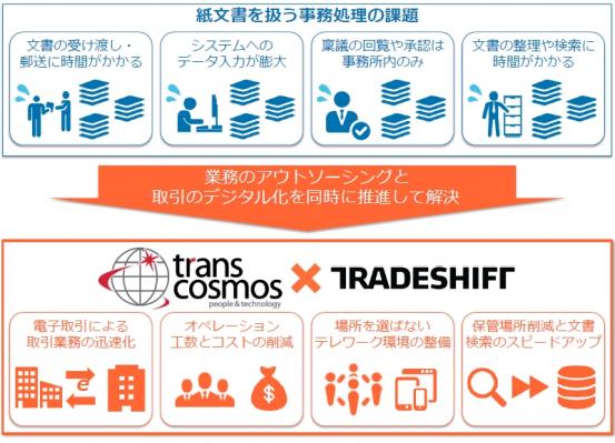 トランスコスモス株式会社(本社:東京都渋谷区、代表取締役社長兼COO:奥田昌孝、証券コード:9715、以下、トランスコスモス)とグローバル電子取引プラットフォーム「Tradeshift」を提供するトレードシフトジャパン株式会社(本社:東京都渋谷区、代表取締役社長:大久保紀章、以下、トレードシフト)は本日2017年6月5日(月)に協業に向け合意しました。高い付加価値を提供するサービスの企画、マーケティング活動および販売活動を実施していきます。今回の協業により、トランスコスモスが提供しているBPOサービスにトレードシフトの電子取引プラットフォームを組み合わせ、間接業務のデジタル化を推進し、取引の即時性やペーパーレス化を支援します。