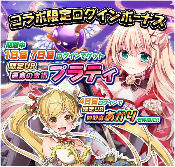 さらに、ログイン日数に応じて、コラボ限定UR「遷命の金術プラティ」を最大2体、UR「四野森あかり」を最大1体がゲットできる!