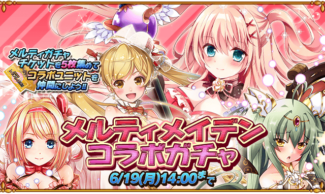 期間限定のメルティメイデンコラボガチャで、コラボ限定UR「遷命の金術プラティ」、UR「四野森あかり」、UR「幸鐘のフェア」、UR「竜城主ユエル」を仲間にしよう!ガチャを引くための「メルティガチャチケット」は一日1回のスペシャルクエストやハコニワ、イベントミッションなどでゲットできます。