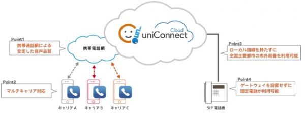 IP-LineとuniConnectCloudはこの度の連携により、各拠点にゲートウェイを設置せずとも固定電話を利用できる他、全国主要都市の市外局番の利用を可能にし、初期コストがネックとなりがちな小規模なオフィスを含め、より多くのお客様へ手軽にFMC対応PBXサービスの提供が可能となります。