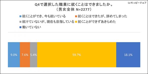 また、「なりたかった職業に就くことはできたかどうか」を聞いたところ(図3)、「就くことができずあきらめた」が全体の59.7%にのぼりました。しかし一方で、5.4%の人が「就けていないが、現在も目指している」と回答しました。