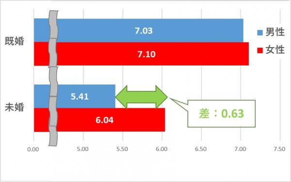 図1では、回答者の男女別、未婚・既婚別に、0点から10点の10段階評価で回答した幸福度実感の平均値を比較しています。男女とも未婚者よりも既婚者の幸福度が高く、また、既婚の男女と比較して、未婚の男女の幸福度の差が大きいことが分かります。結婚により幸福度への影響が大きいのは男性であることがうかがえます。