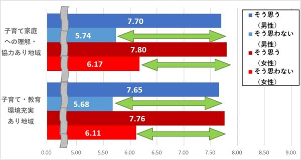 男女とも肯定派の幸福度が高いことから、子育て支援の施設やサービスを充実させることと、子育て家庭に対する地域での助け合いを進めていくことは、同じように子育て世帯の助けになることがうかがえます。